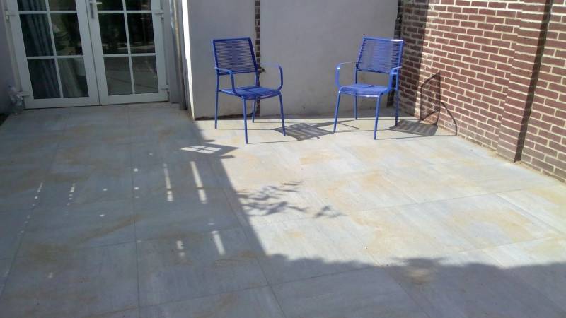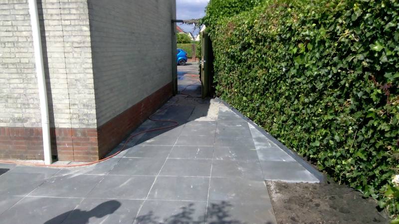 Voor deze tuin grijze betontegels gebruikt van 50 x 50 cm.