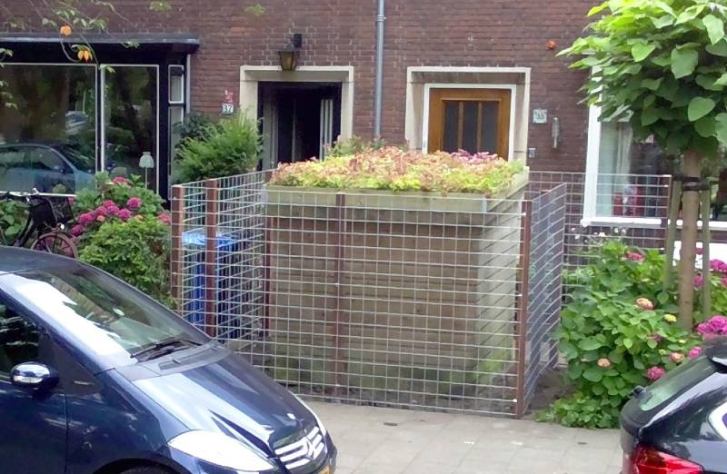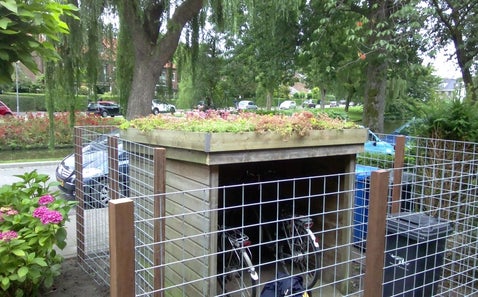 Hekwerk geplaatst en een gezellig groen dak aangebracht op de fietsenstalling. Langs het hekwerk kunnen klimplanten groeien zoals bijvoorbeeld wingerd, klimop (hedera), kamperfoelie, trompetklimmer (campsis), hop, clematis, blauwe regen (wisteria), passiebloem (passiflora), jasmijn, vuurdoorn of een klimhortensia. Misschien kunt u zelfs wel fruit tegen uw schutting of muur laten groeien, zoals druif, framboos of gojibes! Laat u adviseren wat in uw tuin past.